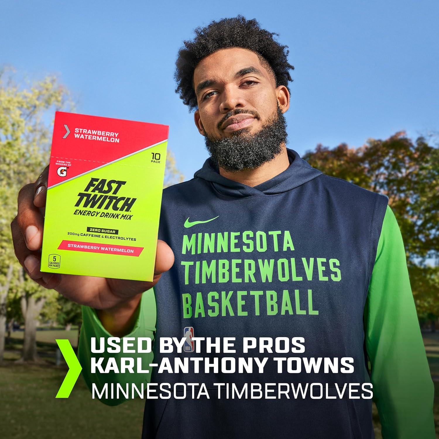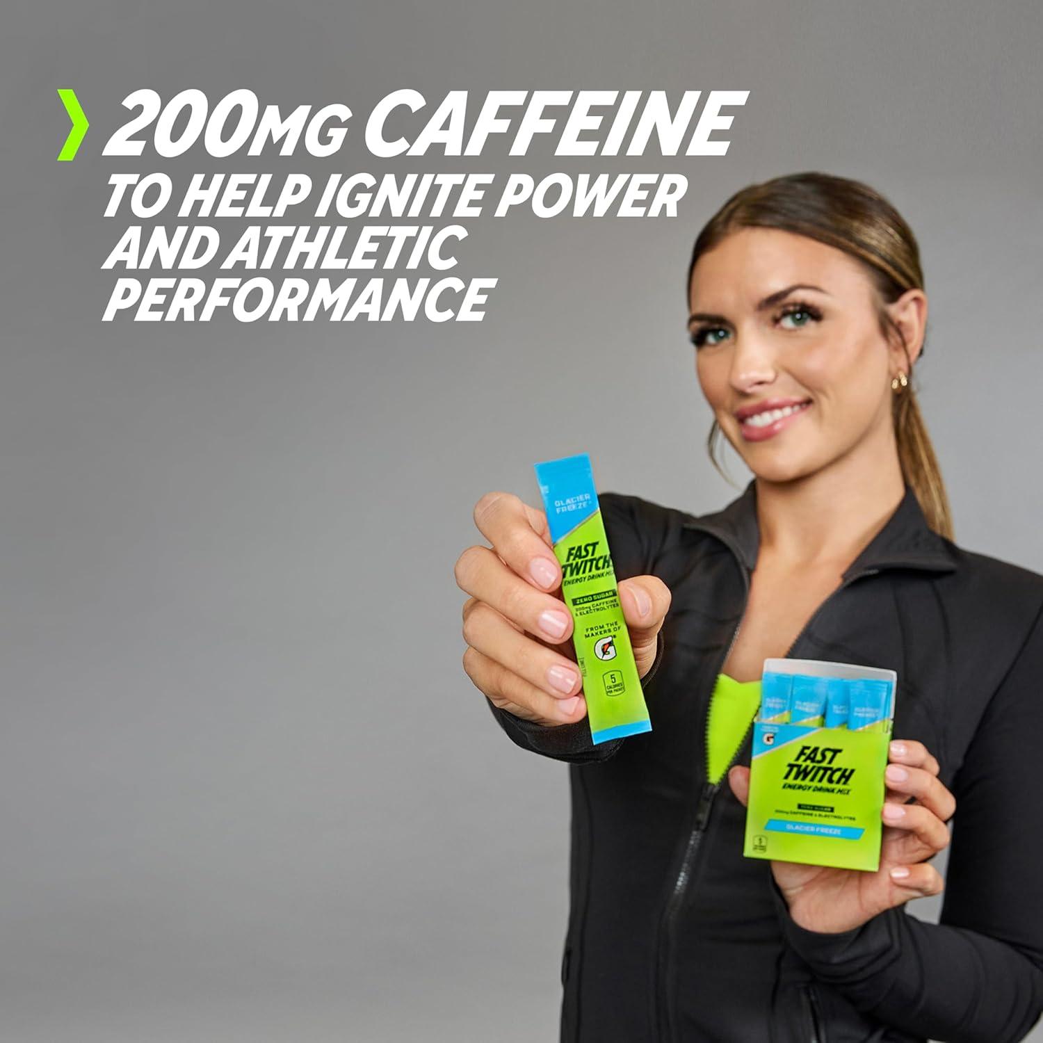 Includes (1) 10-count boxes of Fast Twitch Energy Drink powder packets, Glacier Freeze flavor. A New Energy Drink Mix from Gatorade​ Fast Twitch. Zero Sugar, electrolytes, 200mg caffeine, 100% Daily Value vitamins B6 and B12.