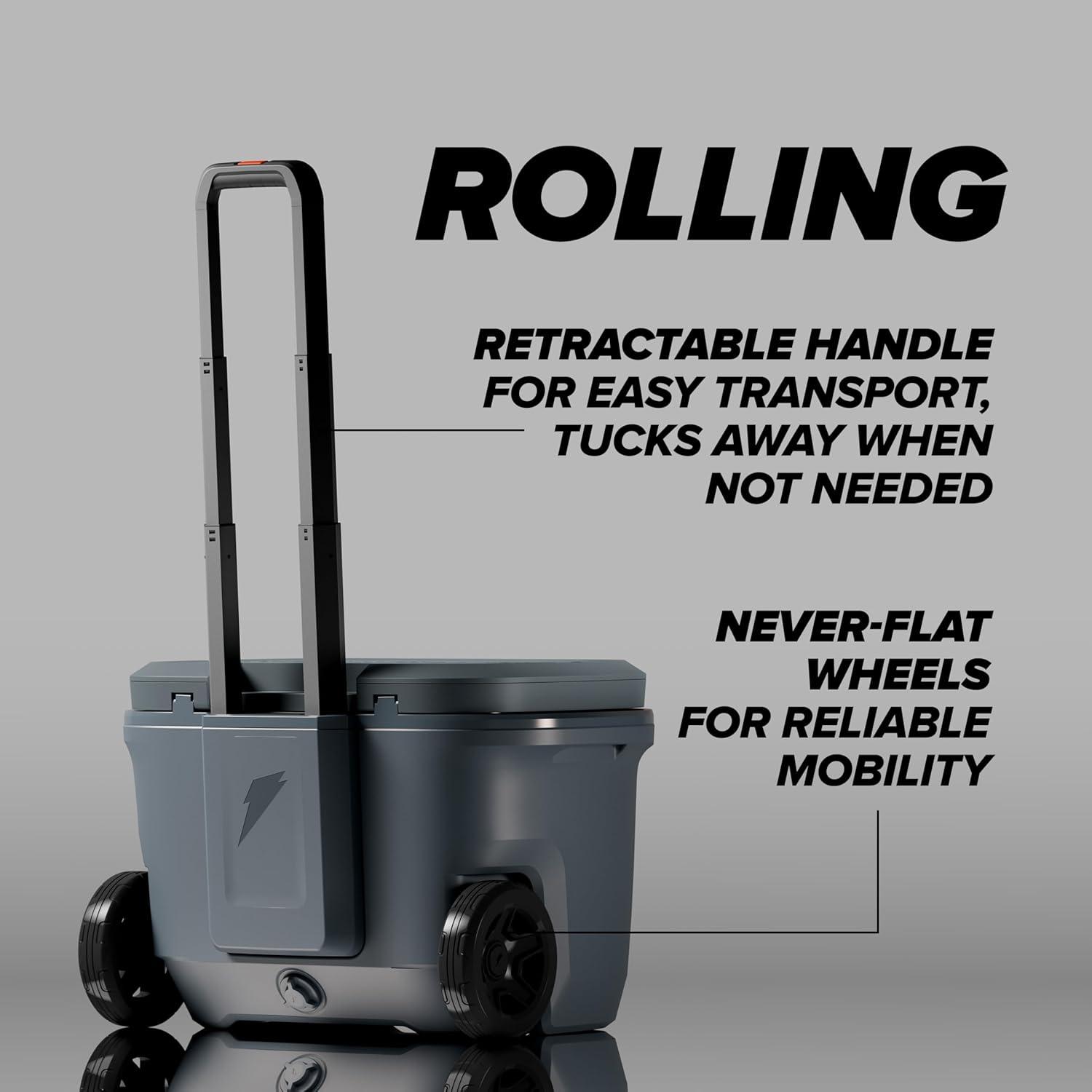 Gatorade Grey 50 Quart Wheeled Cooler with Retractable Periscope Handle, 24-hour insulation, quick-snap latches, and a durable design. Perfect for practice, game days, tailgates.