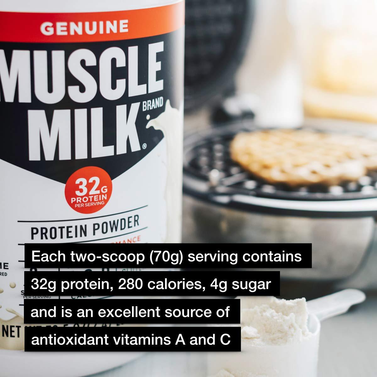 KEY FEATURES – Based on 1 serving, Muscle Milk Genuine Protein Powder contains 32g high-quality protein, 2g sugar, and an excellent source of Calcium and Vitamins A, C & D